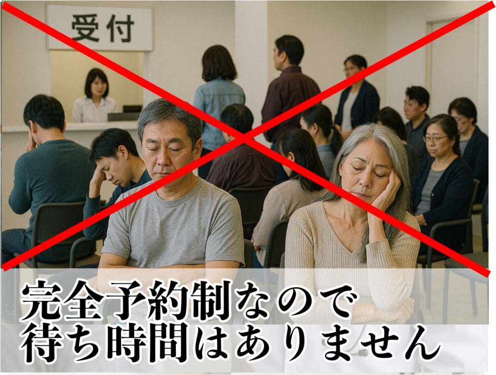 当院はプライベートな空間で施術を受けていただくために、予約制にしております。事前にお電話で予約状況をご確認の上、お越しいただけますようよろしくお願いいたします。